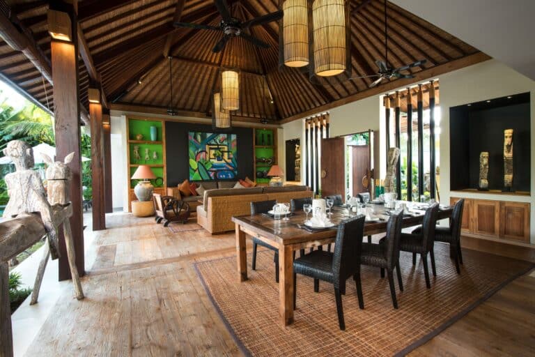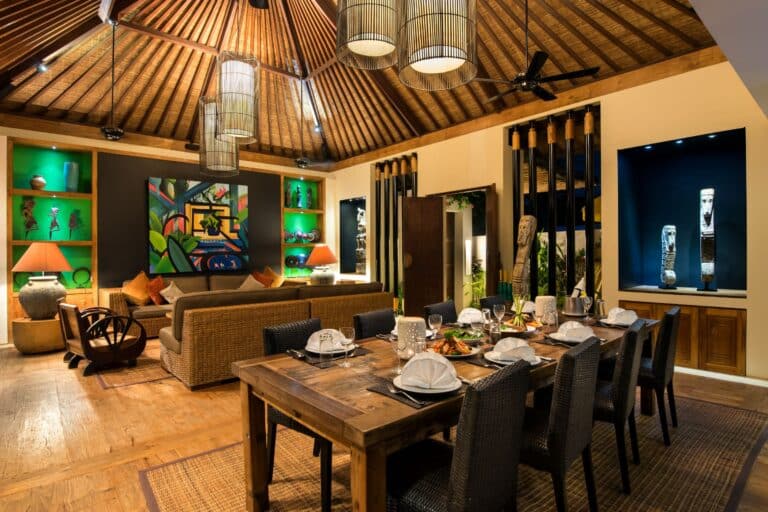 Open-plan living areas that blend modern comfort with traditional Balinese design, living rooms furnished with plush sofas, elegant dining spaces that open to the pool and garden areas.