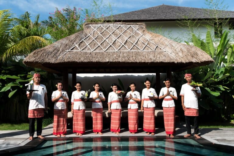 A dedicated team including a villa manager, butlers, gardeners, housekeeping, and security personnel, with additional staff such as night guards, chef, drivers, babysitters, and spa therapists available upon request.