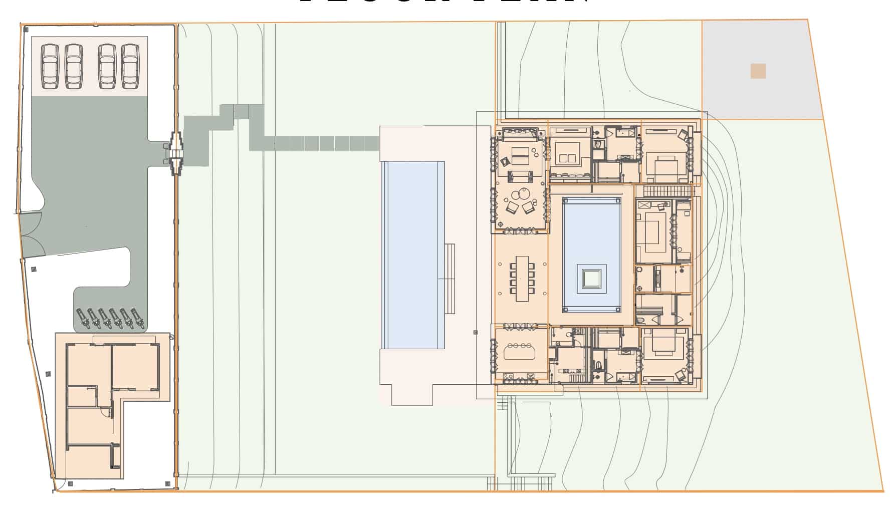 Rumah Rubah makes the most of its tropical setting with beautiful open-air spaces that celebrate natural elements. The open-sided dining room faces the central courtyard and swimming pool on one side and a stunning Japanese-style pond on the other. Frangipani trees and palm trees add greenery, and wood and stone decks offer ample space for relaxation and play.