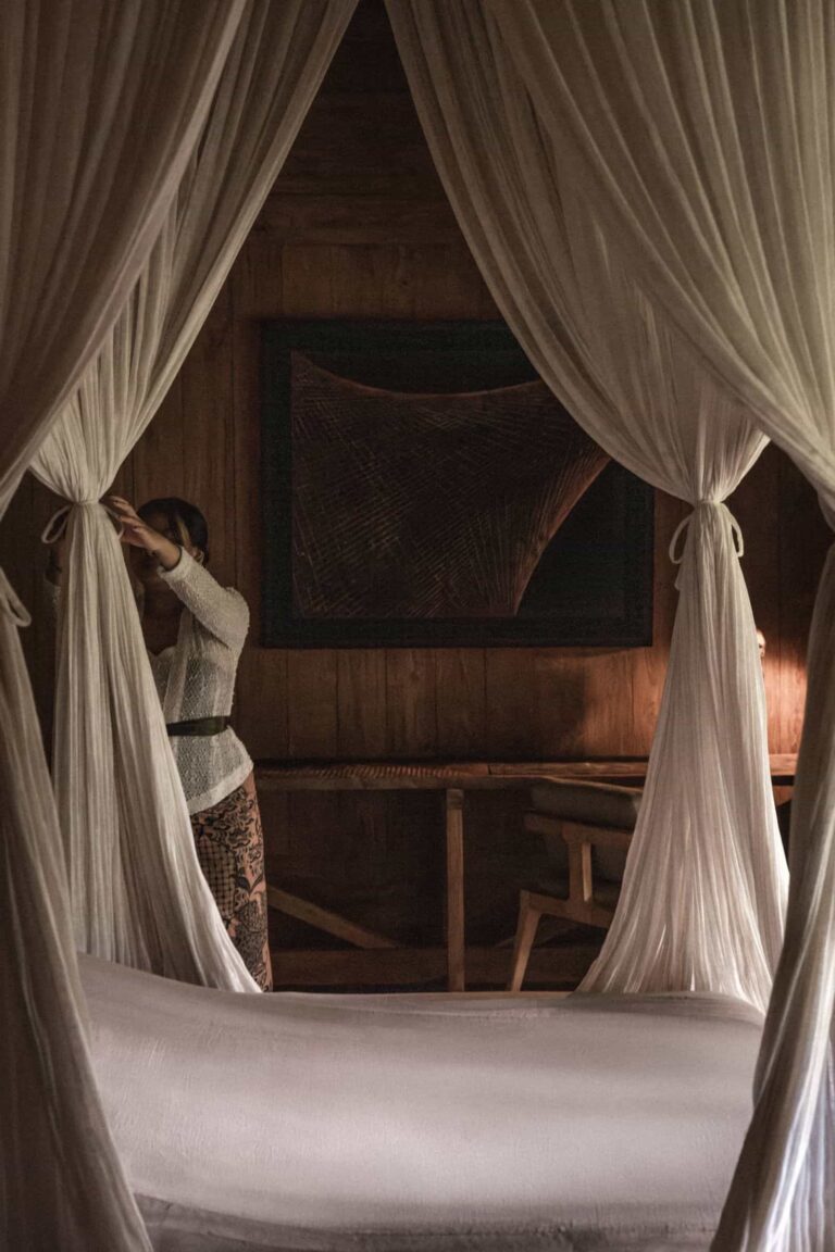 Built on 3,000 square metres in Pererenan, Rumah Rubah is a uniquely designed three-bedroom villa from award-winning Studio Jenquel. Open-sided living spaces and peaked ceilings optimise airflow, while a huge pond and swimming pool further cool down the space. Solar panels provide energy and waste water is recycled to irrigate the lush surroundings. The gorgeous teak wood walls and floors are complemented by woven rugs and minimalist white furnishings for a calming, grounding effect. The result is an exquisite eco-friendly villa perfect for couples, families, and friends.
